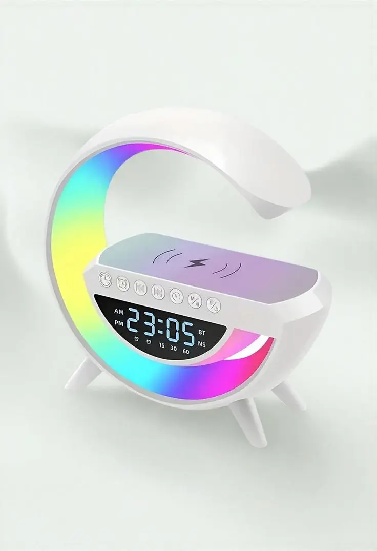 Reloj, velador y cargador en un diseño minimalista.